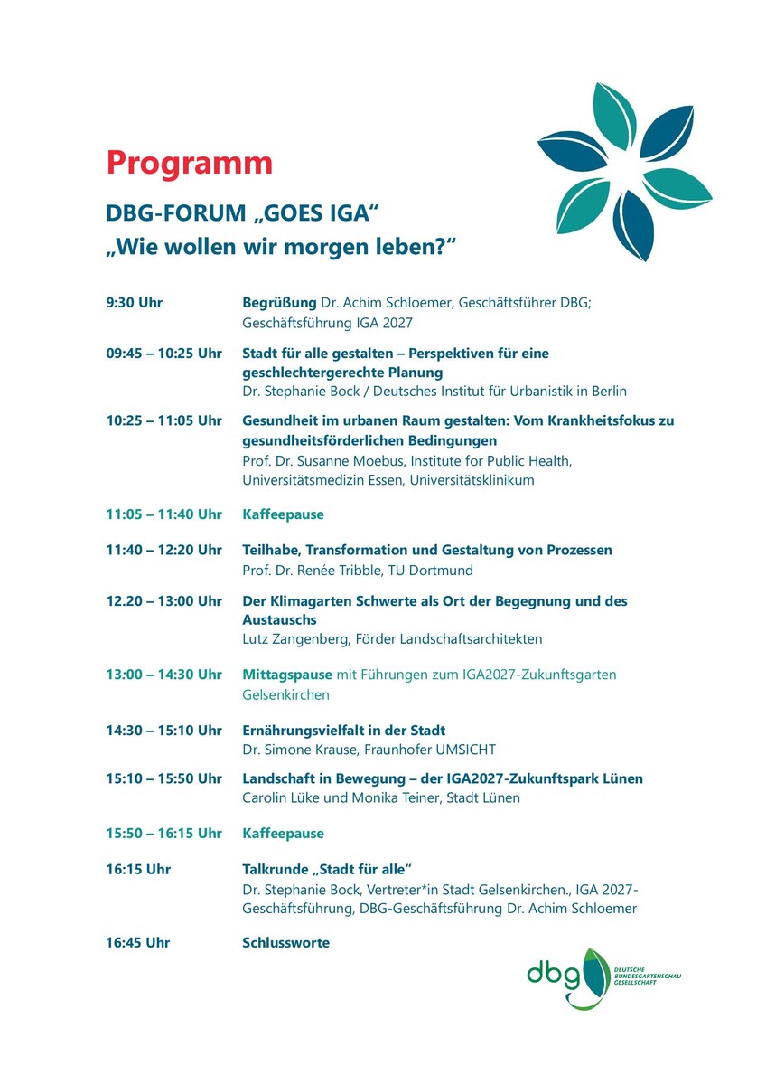 Das Forum der Deutschen BundesgartenschauGesellschaft (DBG) nimmt auch in diesem Jahr wieder räumlich und inhaltlich Bezug zur IGA 2027: Es findet am 13. Novmber 2025 in Gelsenkirchen statt unter dem Motto „Wie wollen wir morgen leben?“ Anmeldungen sind jetzt möglich.