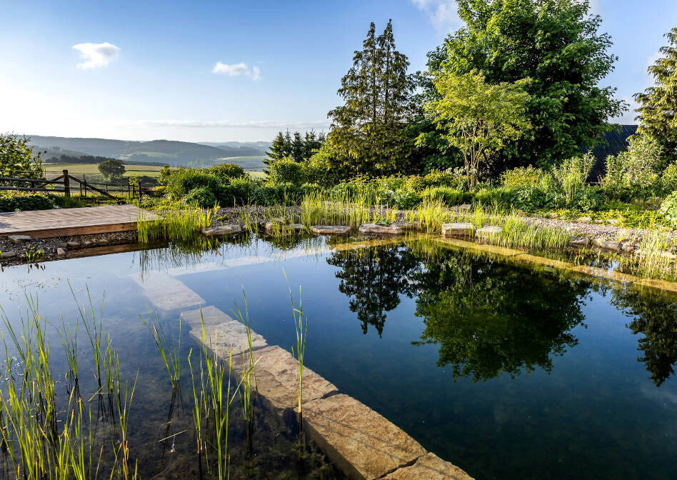 1„Nahtlose Natur“ lautet der Titel des mit dem zweiten Preis ausgezeichneten Privatgartens der Gartenbau Leufgen GmbH. Ein naturnaher Schwimmteich der Kategorie zwei mit insektenfreundlicher Bepflanzung und klarer Linienführung ist der Hauptteil des 300 m2 großen Gartens. Mit Findlingen aus Kalkstein und einer natürlichen Trennung von Schwimm- und Regenerationsbereich wurde eine Oase geschaffen, die der Erholung dient. Besonderen Wert legten die Gestalter auf die harmonische Einbindung des Schwimmteichs in die umgebende Landschaft.