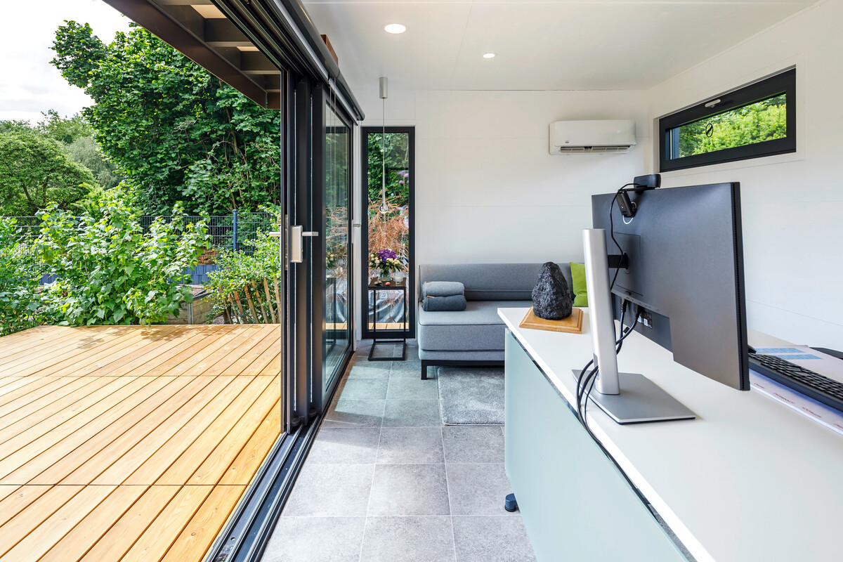 Ab einer Größe von rund 9 m² erhältlich, lässt sich der Raum flexibel für unterschiedliche Zwecke einrichten. Mit Blick ins Grüne ist das Mikrohaus der ideale Arbeitsbereich und ebenso ein eigenständiger Raum für Hobbys, Kinder oder Gäste.