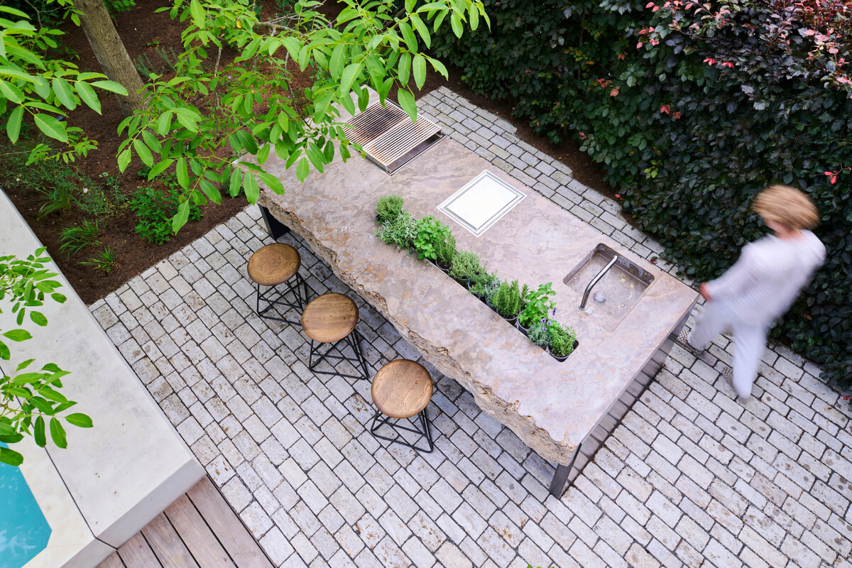 von Hauser Naturstein erschienen am 12.03.2026Gefertigt in der oberbayerischen Manufaktur von Hauser Naturstein, ruht der monolithische Korpus auf präzise gearbeiteten Metallwangen, die entweder aus charaktervollem, geschwärztem Rohstahl mit ausgesuchter Zunderoberfläche oder aus absolut rostfreiem Black Inox bestehen. Arbeitsflächen, Spülbecken und die praktische Pflanzrinne fügen sich harmonisch in das Design ein. Die natürliche Kruste des Steins unterstreicht dabei den individuellen Charakter. Jede Fläche ist ein Unikat aus Stein, das durch seine natürliche Härte jedem Wetter trotzt – eine Qualität, die als bleibender Wert für Jahrzehnte unter freiem Himmel steht.