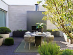 Der knapp 50 Quadratmeter große Atriumgarten repräsentiert den Stil moderner Wohngärten. Er verbindet sich mit den nahtlos übergehenden Wohnräumen. Der mit viel Sensibilität und Gespür für Materialien und Farben gestaltete Atriumgarten widerspiegelt die Trends der Ausstattung vielfältig gestalteter Wohnräume unter freiem Himmel.
