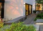 Schattenspiel: Die Fassade wirkt als Leinwand, bekommt durch die Schatten des Blaseneschen-Geästs Struktur. Je nach Lichteinfall verändert sich der Effekt. Sitzblöcke: Die Sichtbetonelemente des niederländischen Herstellers geben dem Patio nicht nur einen Rahmen, sondern laden auch zum Aufenthalt ein. Farblich passende Kissen machen es im Sommer gemütlich. Schwebende Stufen: Die massigen Großformatplatten von Schellevis scheinen zu schweben. Das sorgt für Spannung. Die Unterleuchtung unterstreicht die Wirkung der Leichtigkeit; trotz des Gewichts der Stufen.