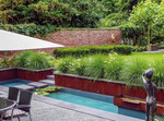 Der Sitzplatz: Lustwandeln auf 450 m² – hier geht es. Im Sommer gibt es ein lauschiges Plätzchen unter Platanen. Die Mauer als Glücksfall: Was gibt es Besseres, um einen Garten zu fassen, als eine alte Backsteinmauer. Hätte man sie bauen müssen, wäre es teuer geworden. Die starke Achse: Über das mit Cortenstahl gefasste Wasserbecken führt der Blick zu der zweiten Plastik, die unter Dachplatanen vor der Mauer platziert ist. Belagswechsel: Der Sitzbereich aus modern formatierten Natursteinplatten scheint in dem Kiesbelag zu schwimmen. Die Bewegungsfläche bleibt gleich, wirkt aber durch die Unterteilung weniger aufdringlich. Der Hingucker: Mit der Statue von Bildhauer Hans Schröder hat Terramanus dem Terrassenraum ein vertikales...