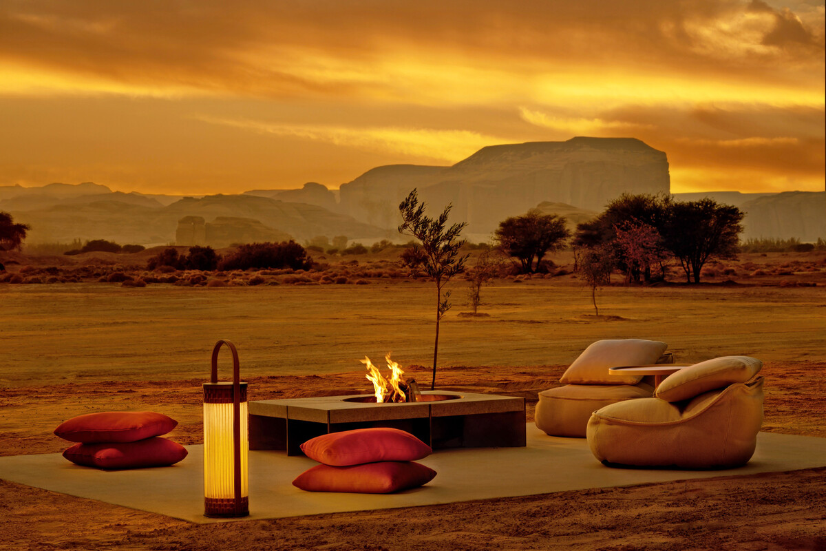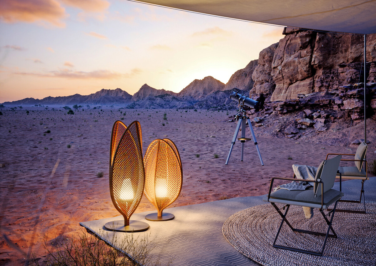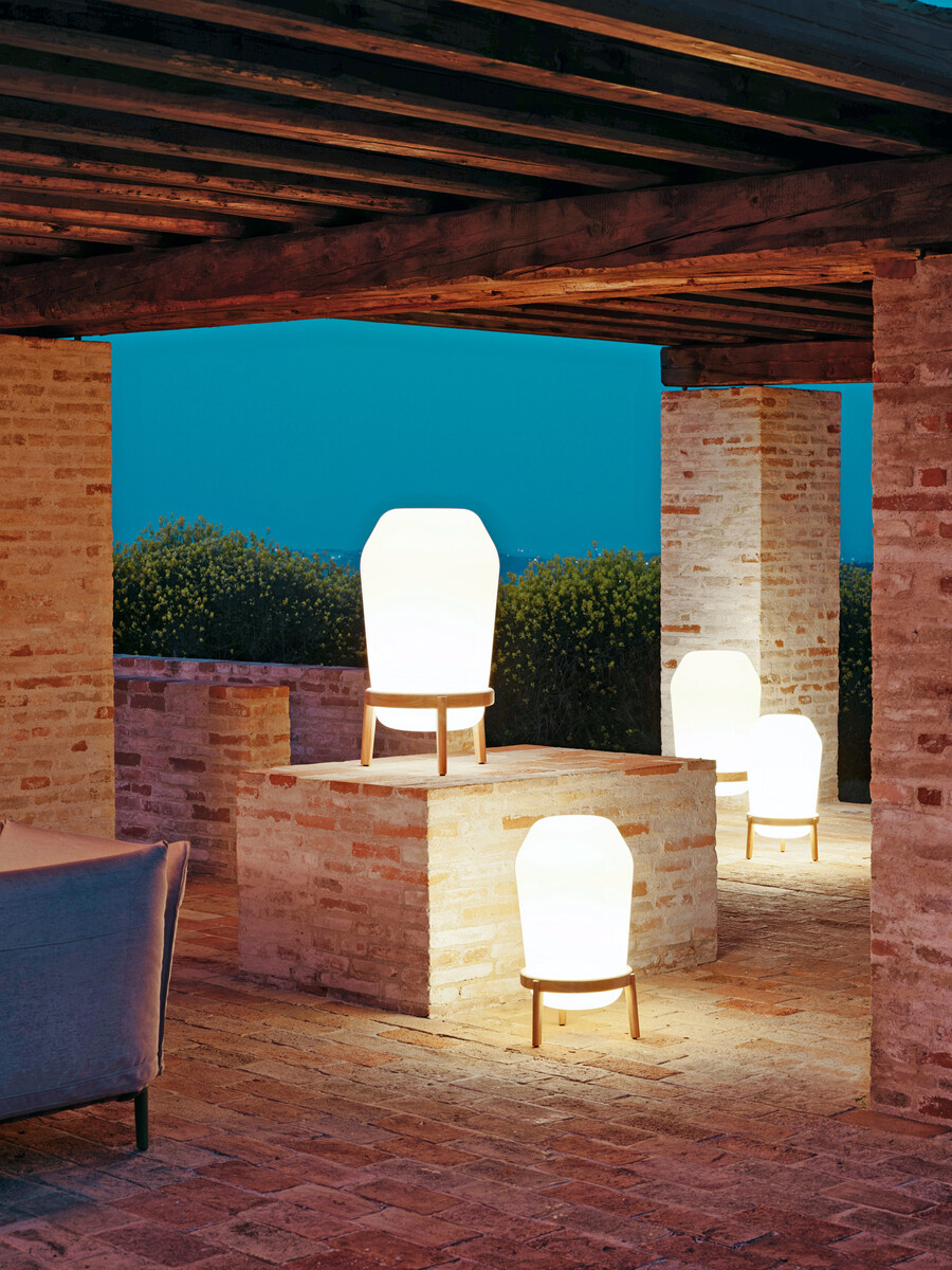 5Loon von Dedon ist ein ballonähnlicher „Lichtbehälter“, der auf einem Teakholzring mit drei Beinen ruht. Er kann leicht zum Aufladen bewegt werden und wird mit Dimmer und Fernbedienung geliefert.