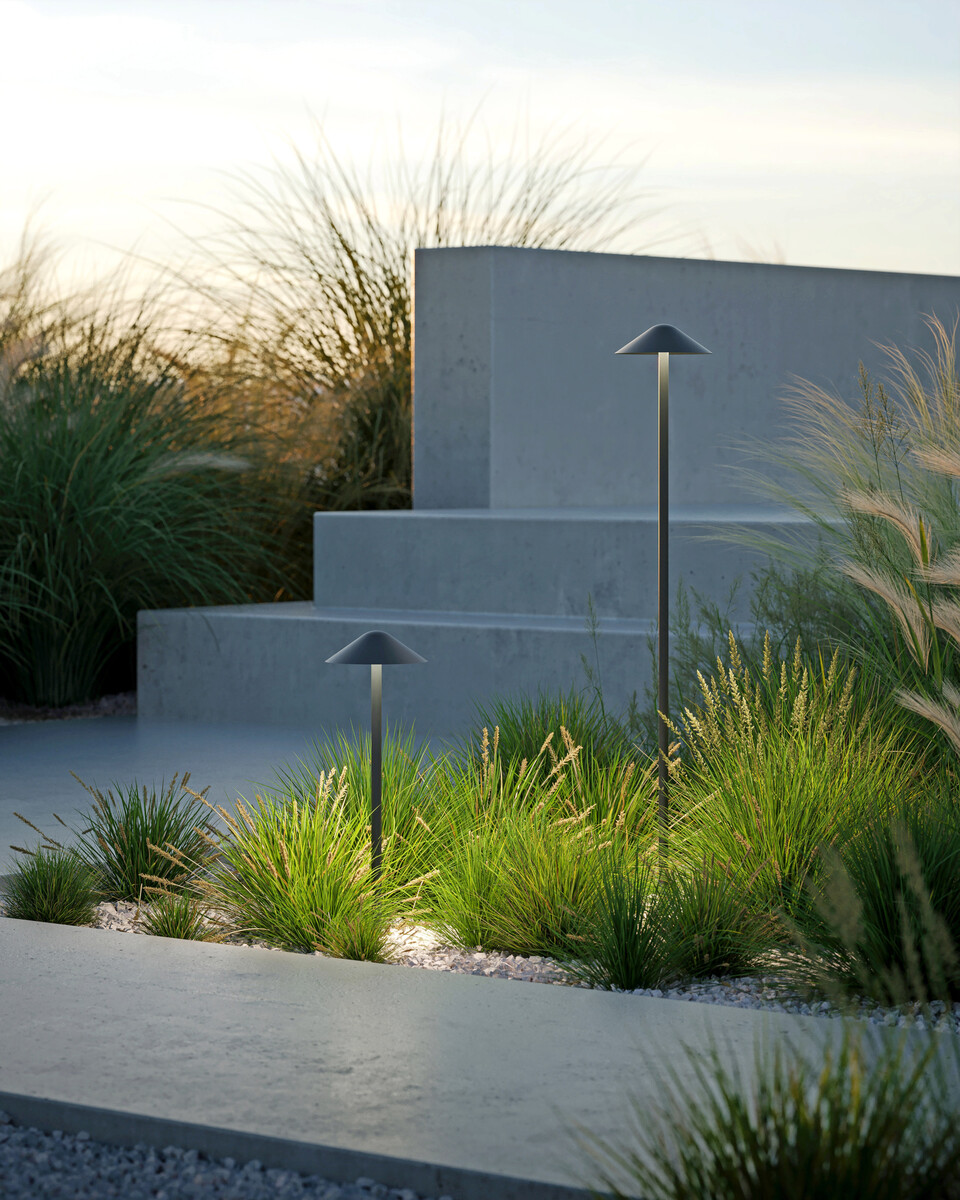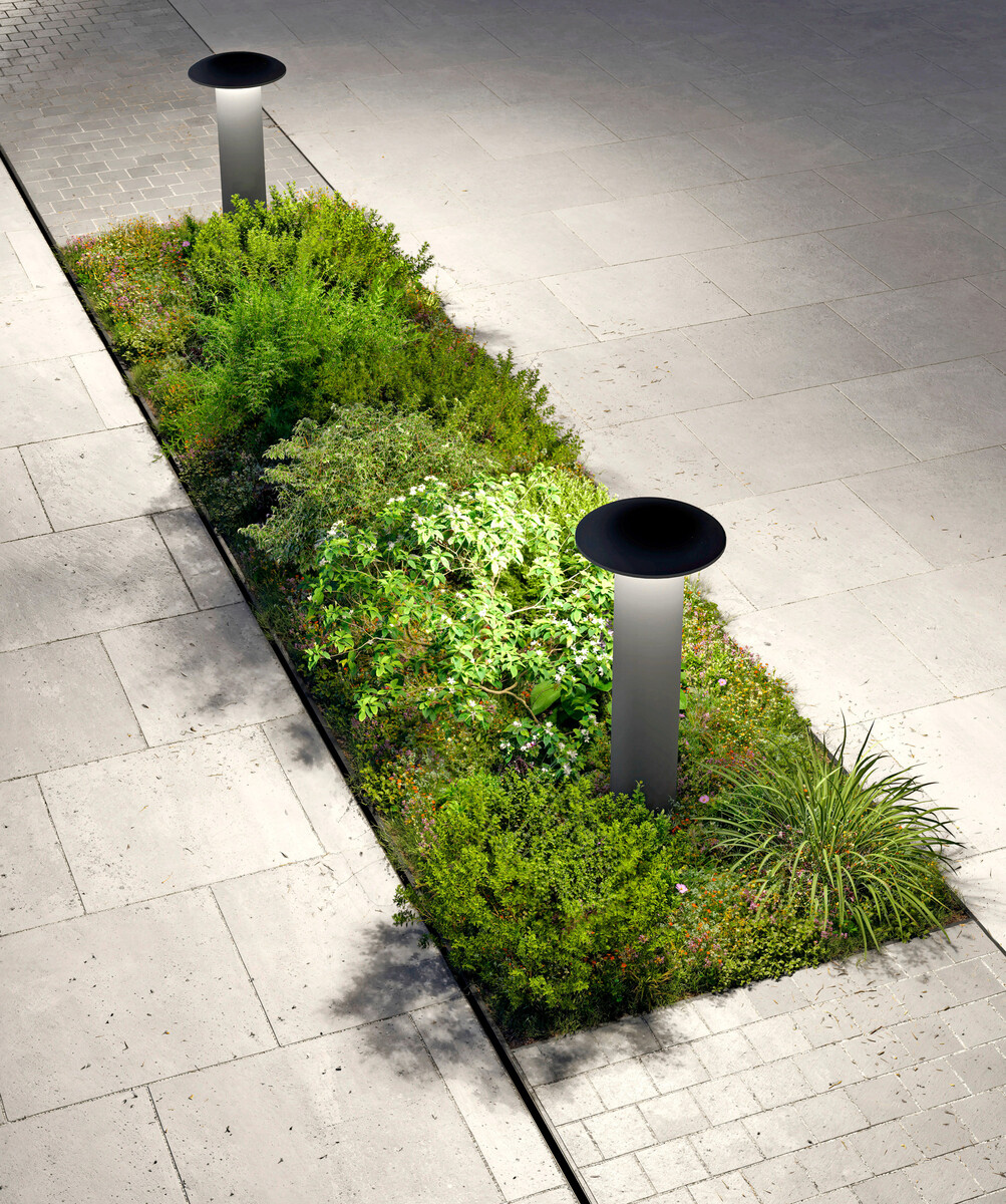 2Aus der konischen Form der Leuchtenfamilie Vea entstanden zwei Pollerleuchten in unterschiedlichen Höhen, die eine gleichmäßige Beleuchtung von Grünflächen und Gehwegen ermöglichen. Der nach unten gerichtete Leuchtenkopf sorgt für eine gezielte Lichtverteilung, reduziert Blendung und unterstreicht die Lichtqualität. Die Vea-Pollerleuchten sind in zwei Größen und in Anthrazit und „black green“ erhältlich.