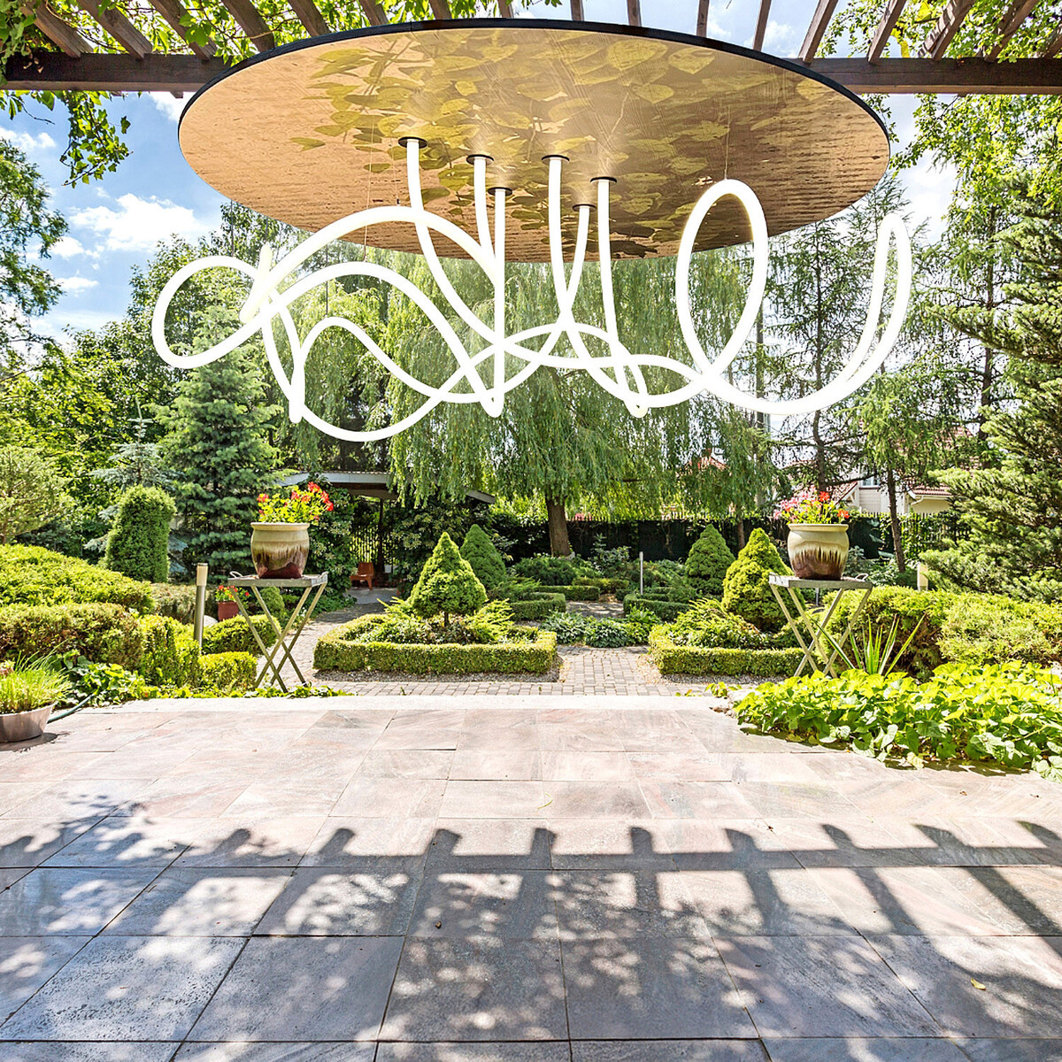 Ebenso individuell wie die Art der gewählten Lichtlinie gestaltet Dot-spot den Baldachin der Leuchte. Auf der Rückseite des Baldachins befinden sich die Anschluss- und die Steuerungstechnik sowie die Aufhängung der Leuchte. Die Ausstattung ist frei und erfolgt gemäß Anforderung. So können MagicLine lighting design objects zum Beispiel über Funk gesteuert, in das Beleuchtungssystem des Gartens oder auch in ein Gebäudemanagementsystem eingebunden werden.